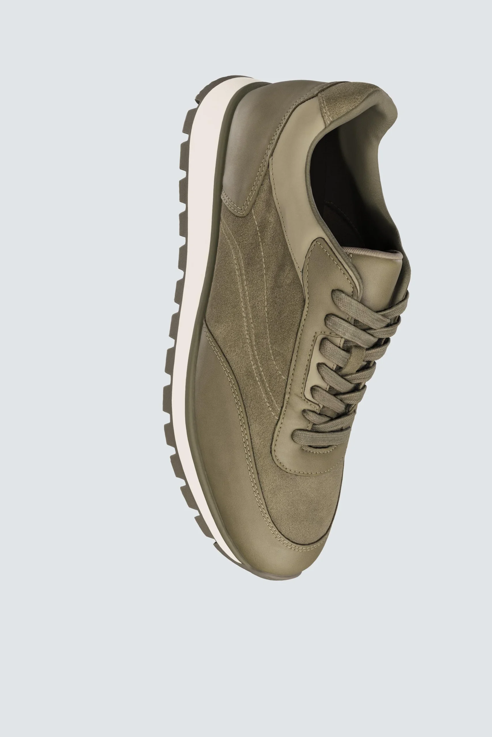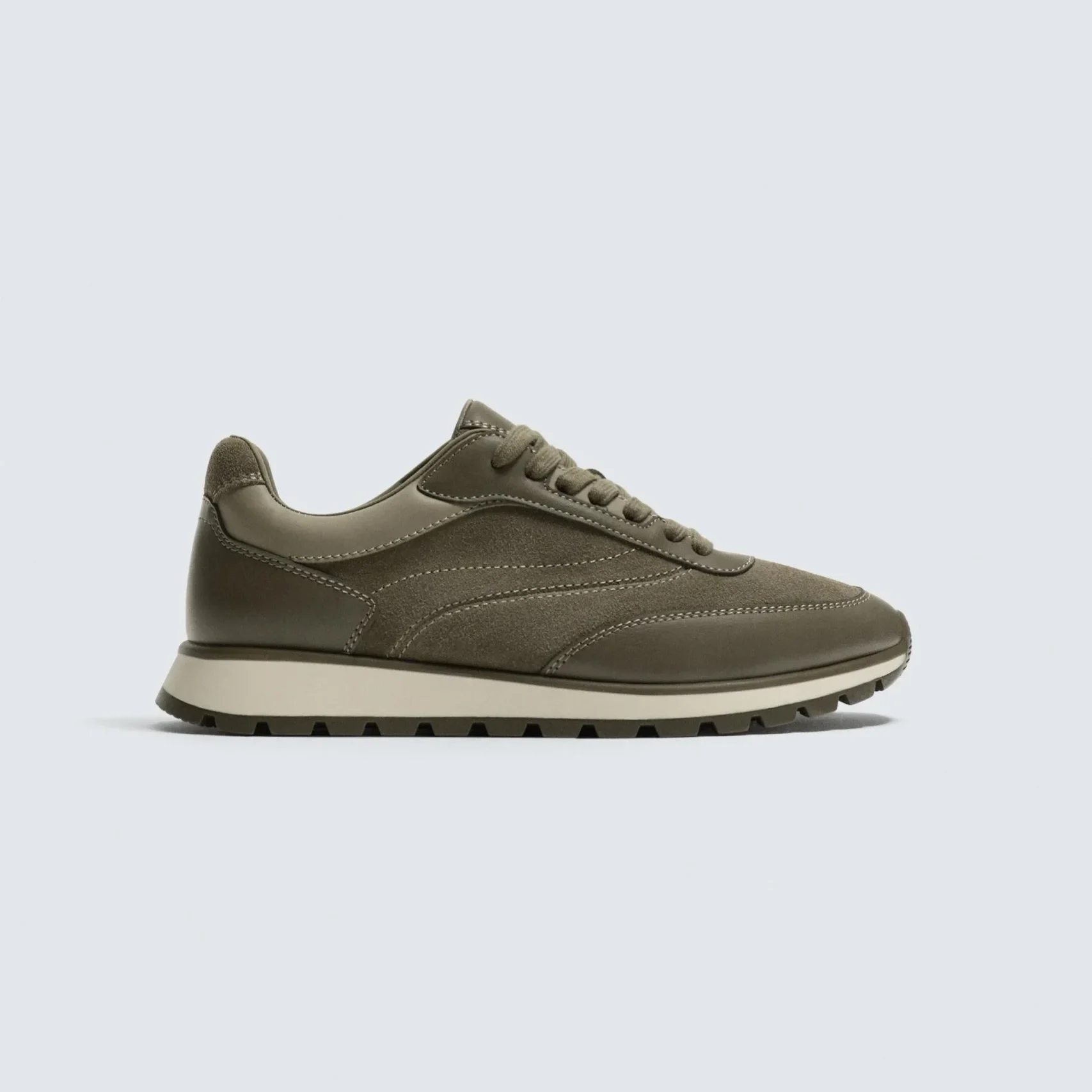 - Design: طراحی اسپرت با رویه چند تکه و جزئیات چرم جیر، به همراه نوک گرد و زیره شیاردار.