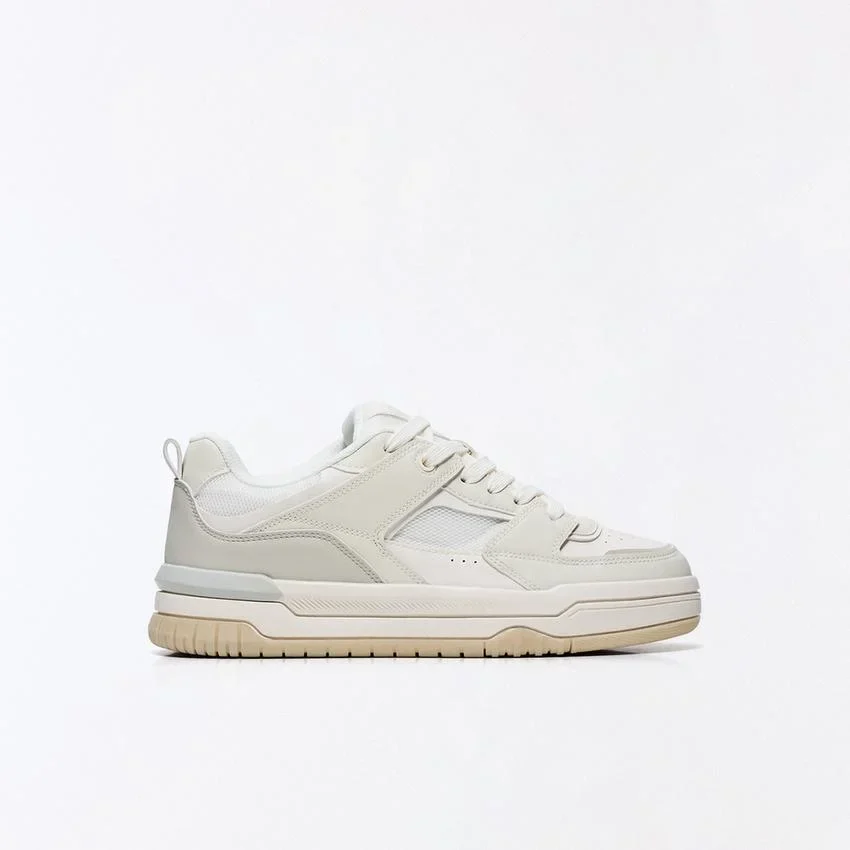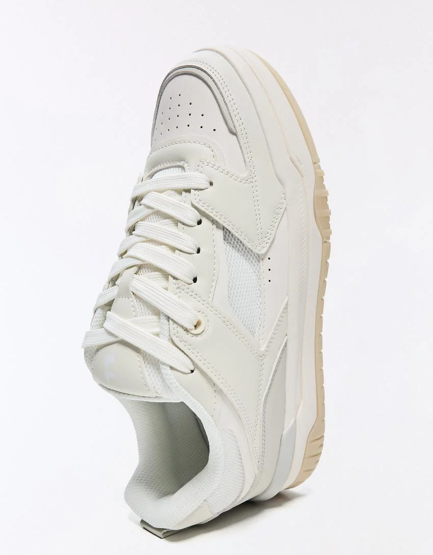 - طراحی: این محصول با الهام از سبک مدرن چانکی و با استفاده از پنل های چندتکه در رویه طراحی شده است که ظاهری حجیم، جسورانه و کاملاً مطابق با ترندهای روز دنیای مد دارد. رنگ سفید یکدست آن باعث می شود تا این کفش به راحتی با انواع استایل های کژوال و خیابانی هماهنگ شود.