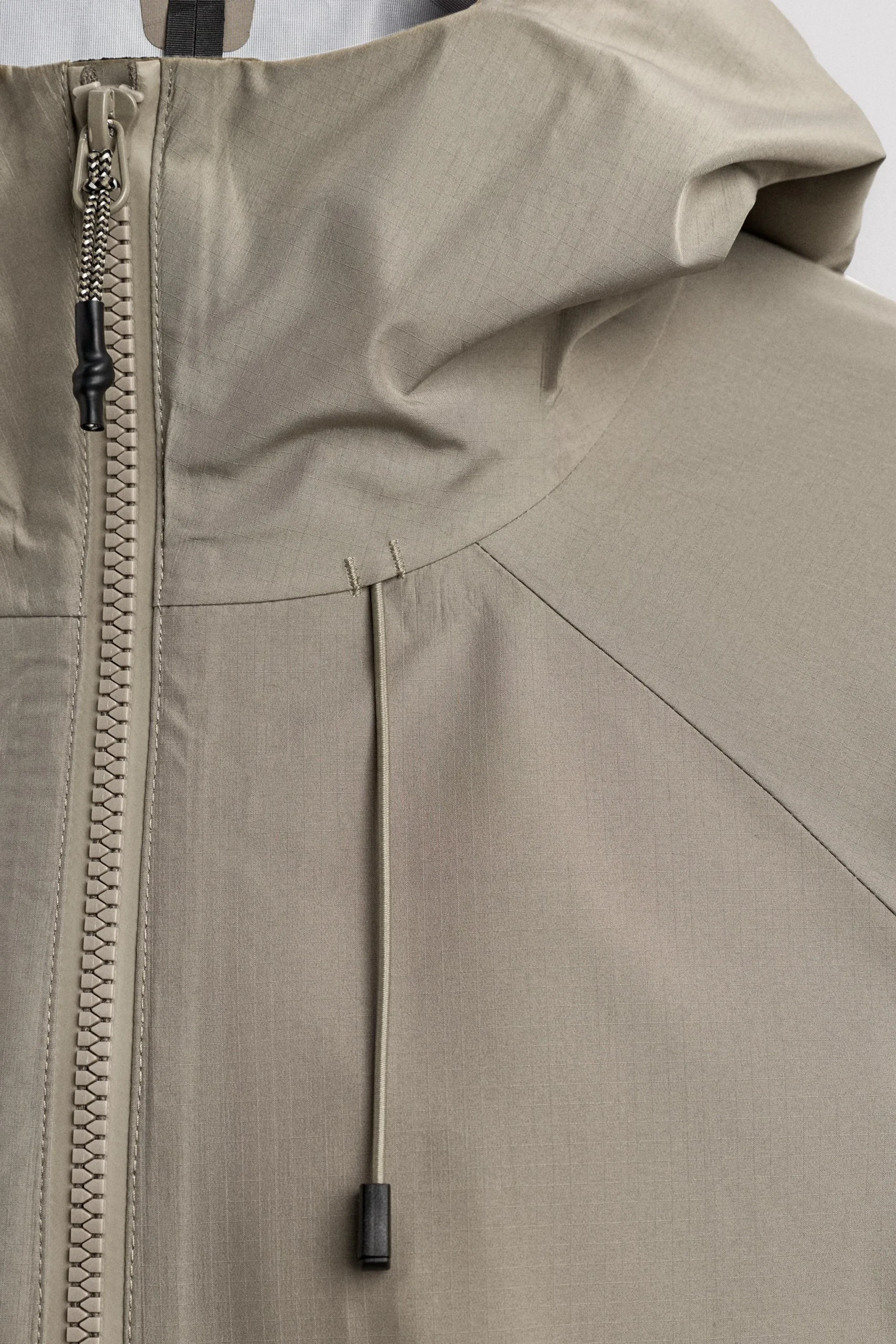 - یقه بلند با کلاه قابل تنظیم توسط کش، برای محافظت بیشتر.