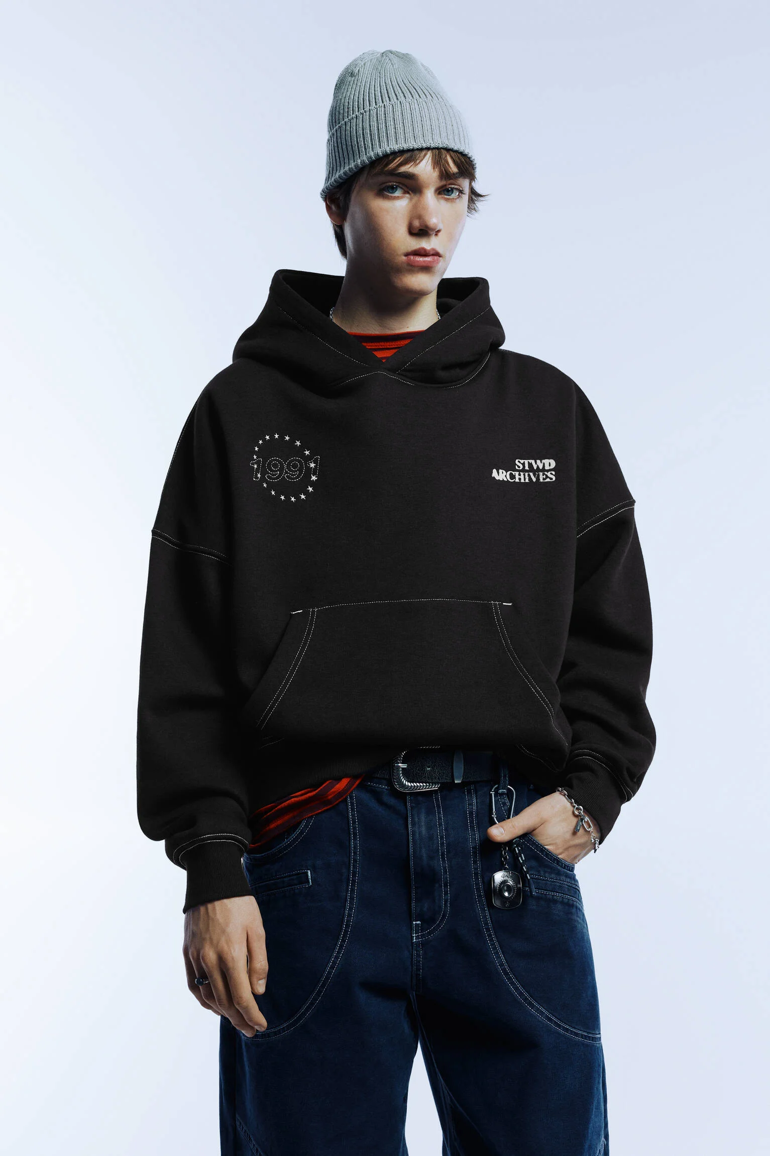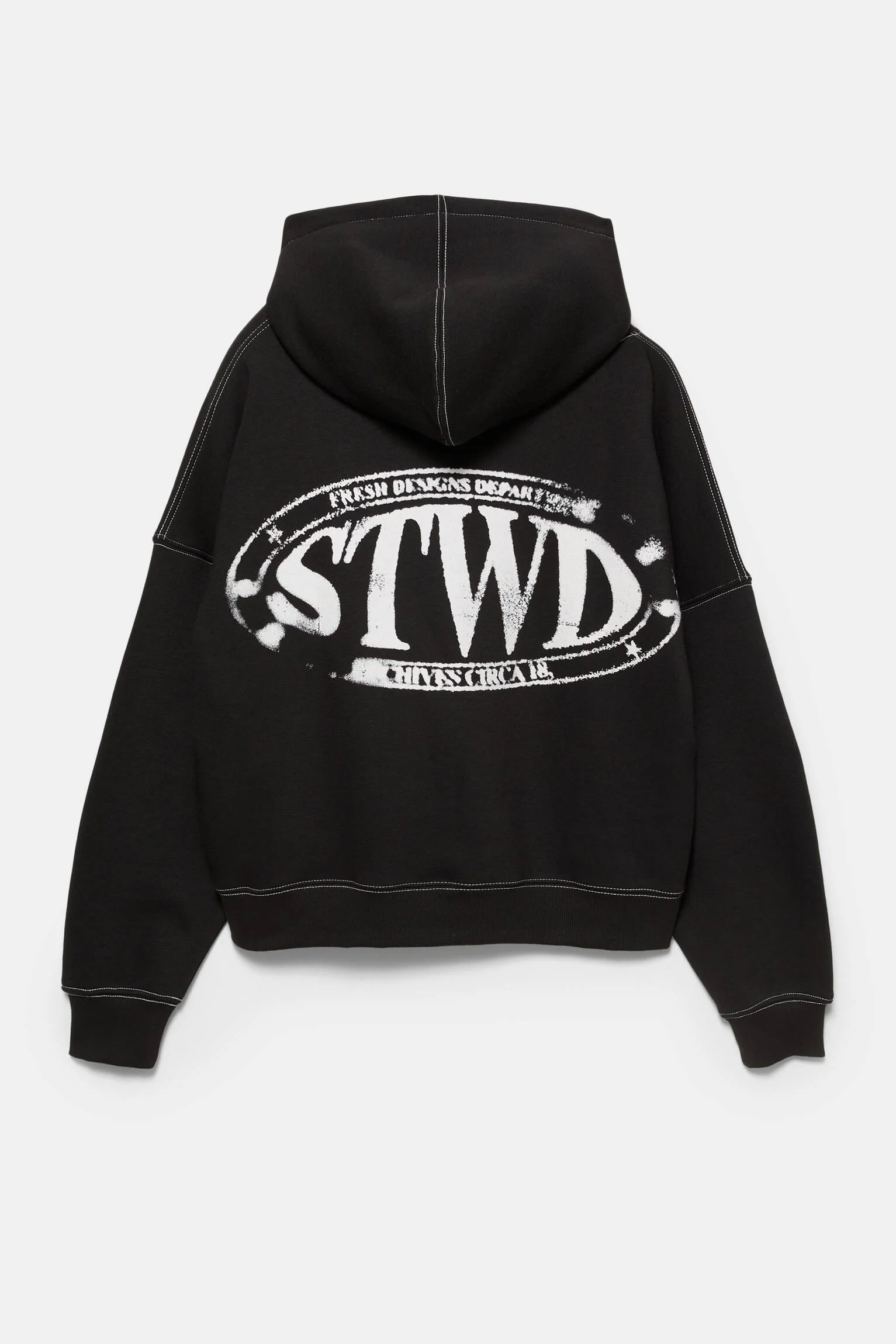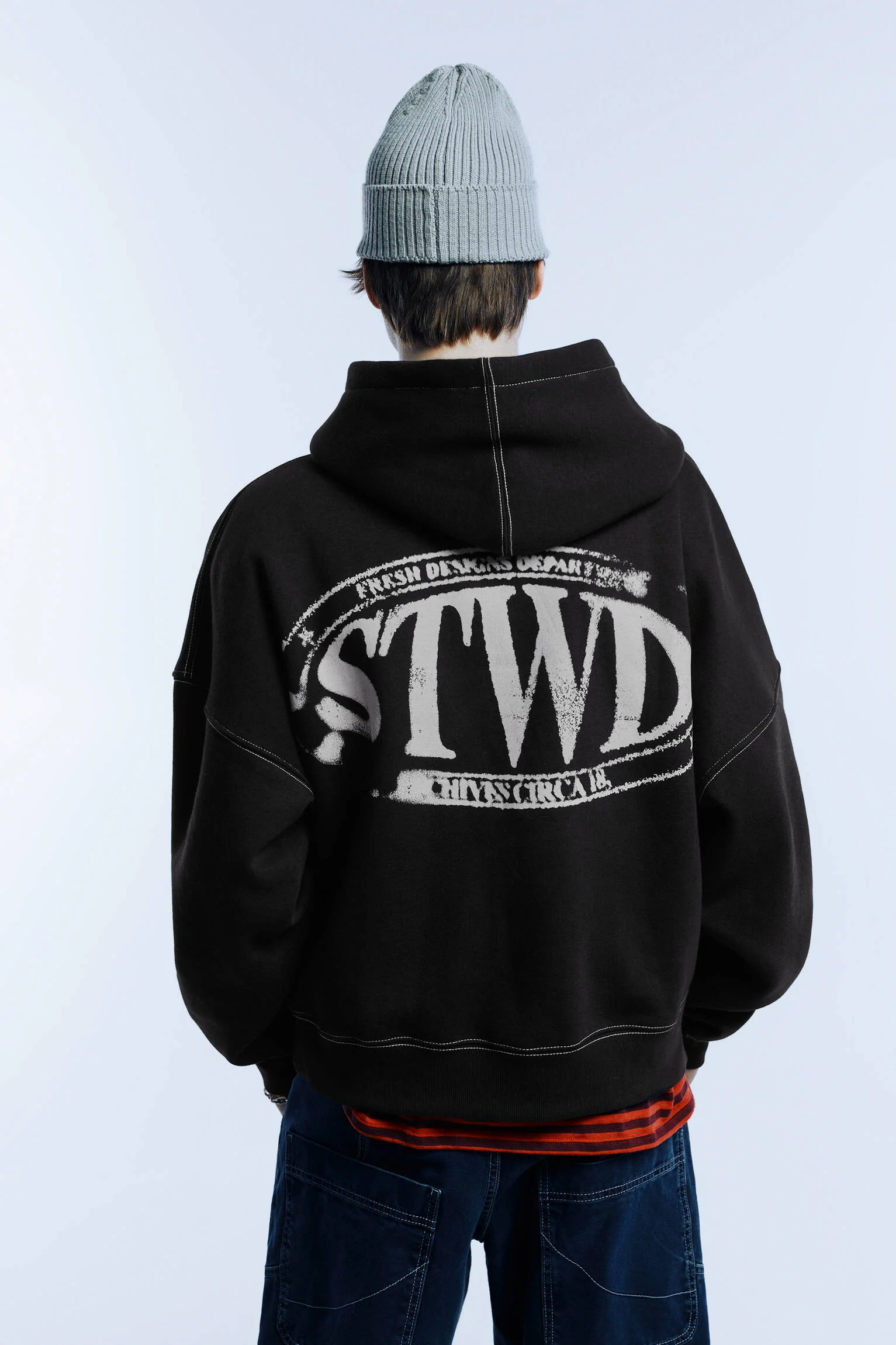 - طراحی: این هودی با رنگ مشکی کلاسیک و جزئیات گرافیکی STWD به صورت کنتراست طراحی شده است که ظاهری مدرن و جذاب به استایل خیابانی و کژوال شما می بخشد.