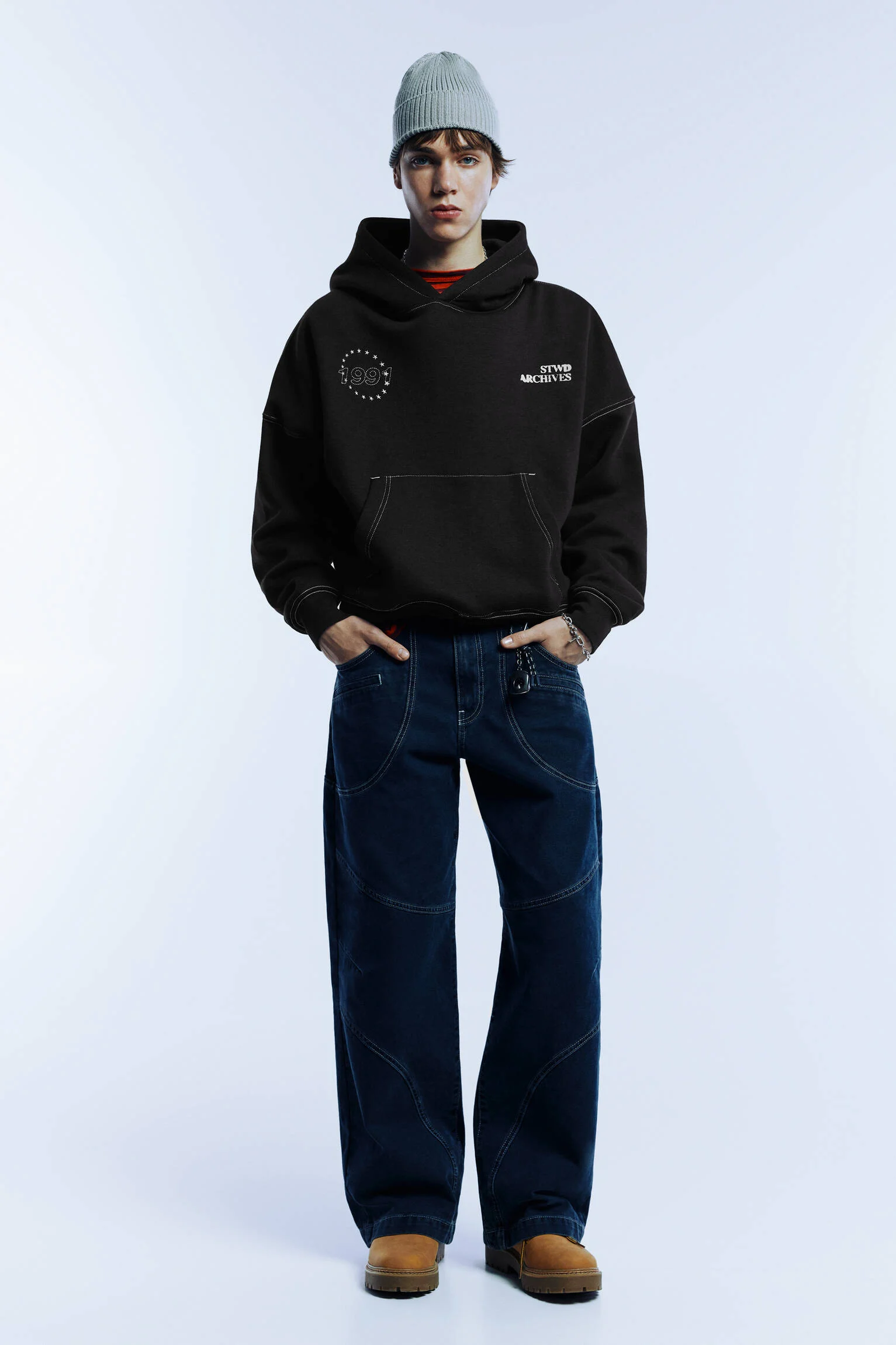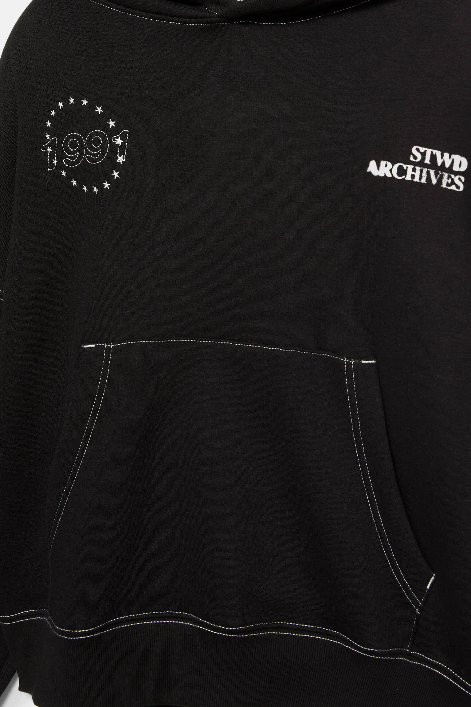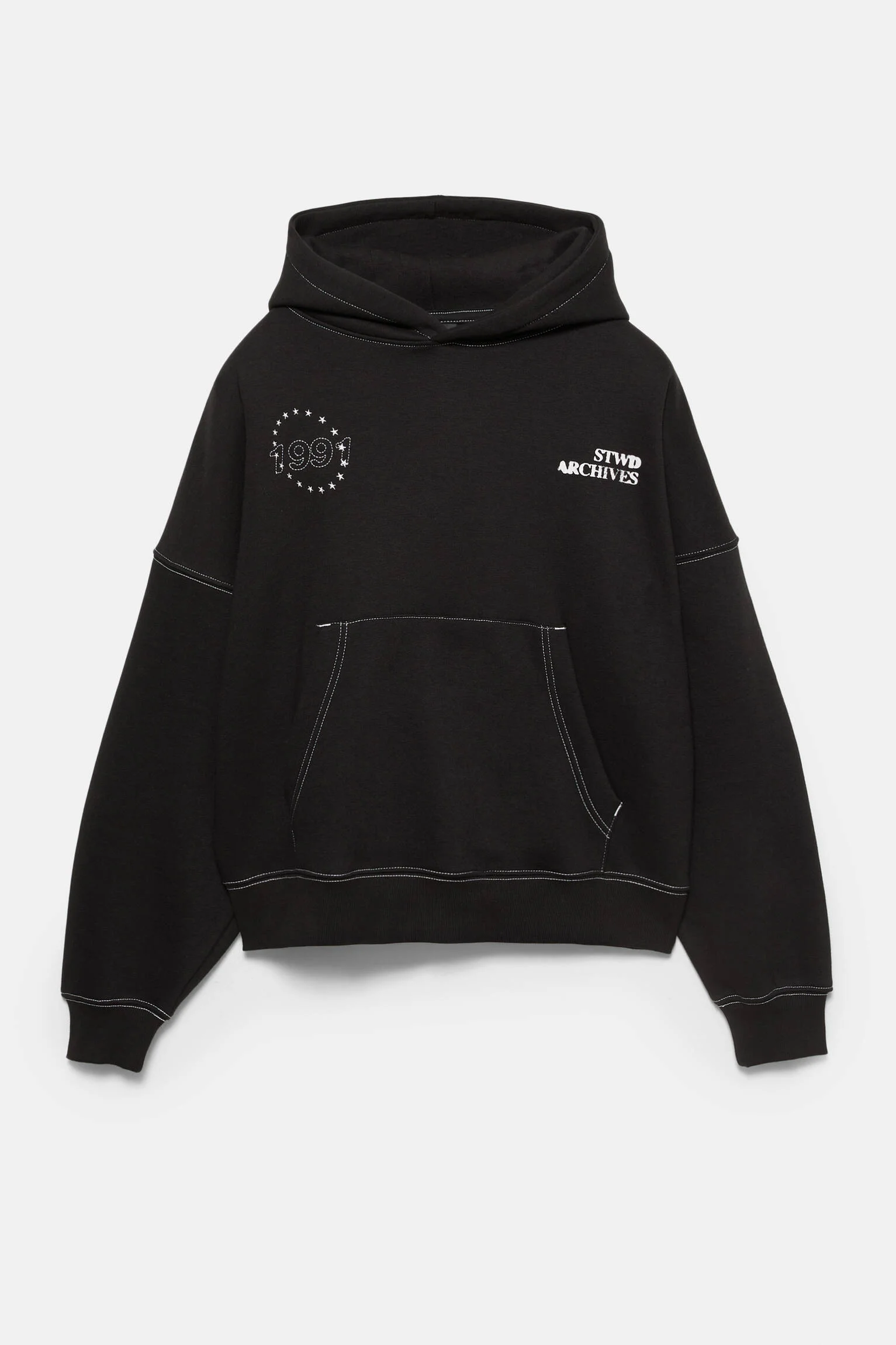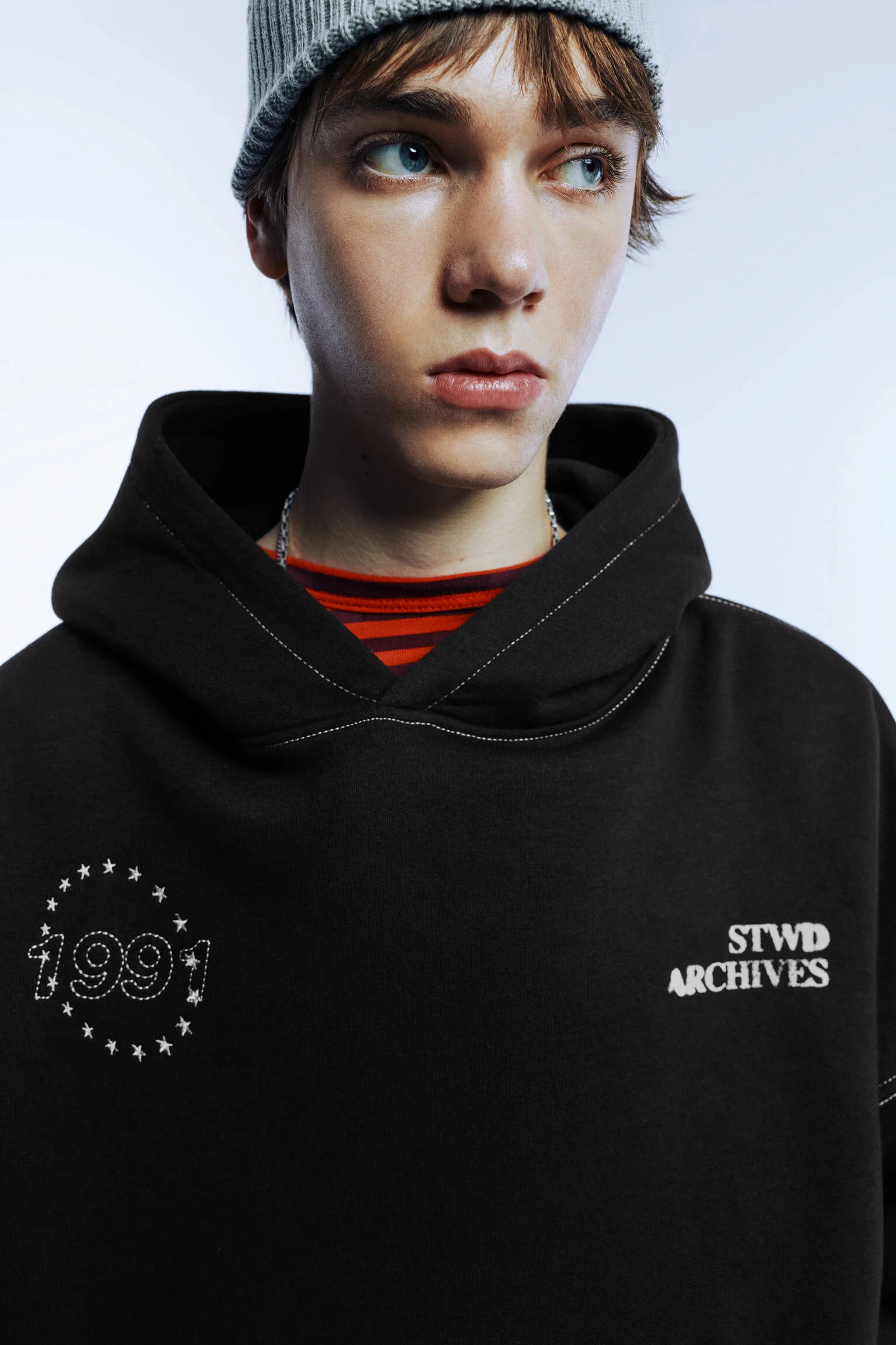 - طراحی: این هودی با رنگ مشکی کلاسیک و جزئیات گرافیکی STWD به صورت کنتراست طراحی شده است که ظاهری مدرن و جذاب به استایل خیابانی و کژوال شما می بخشد.