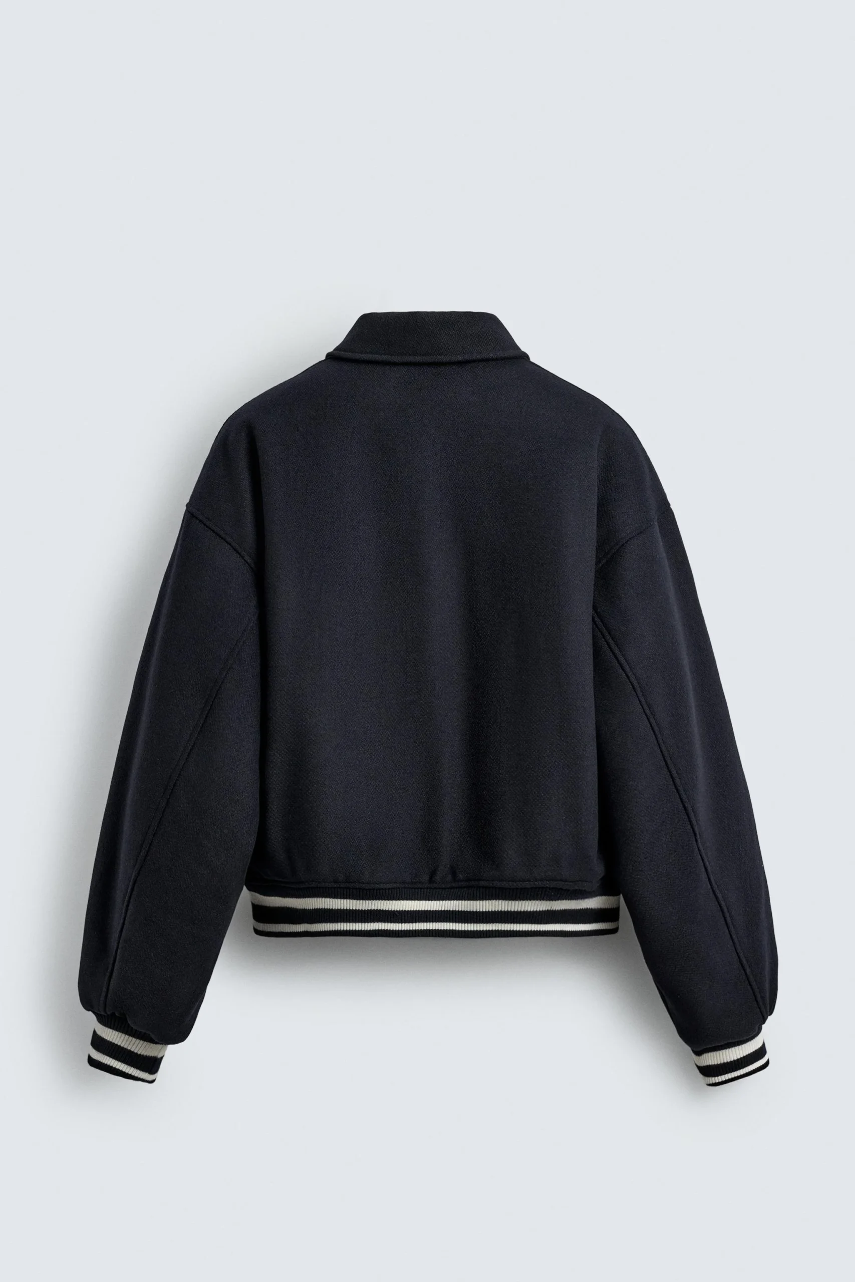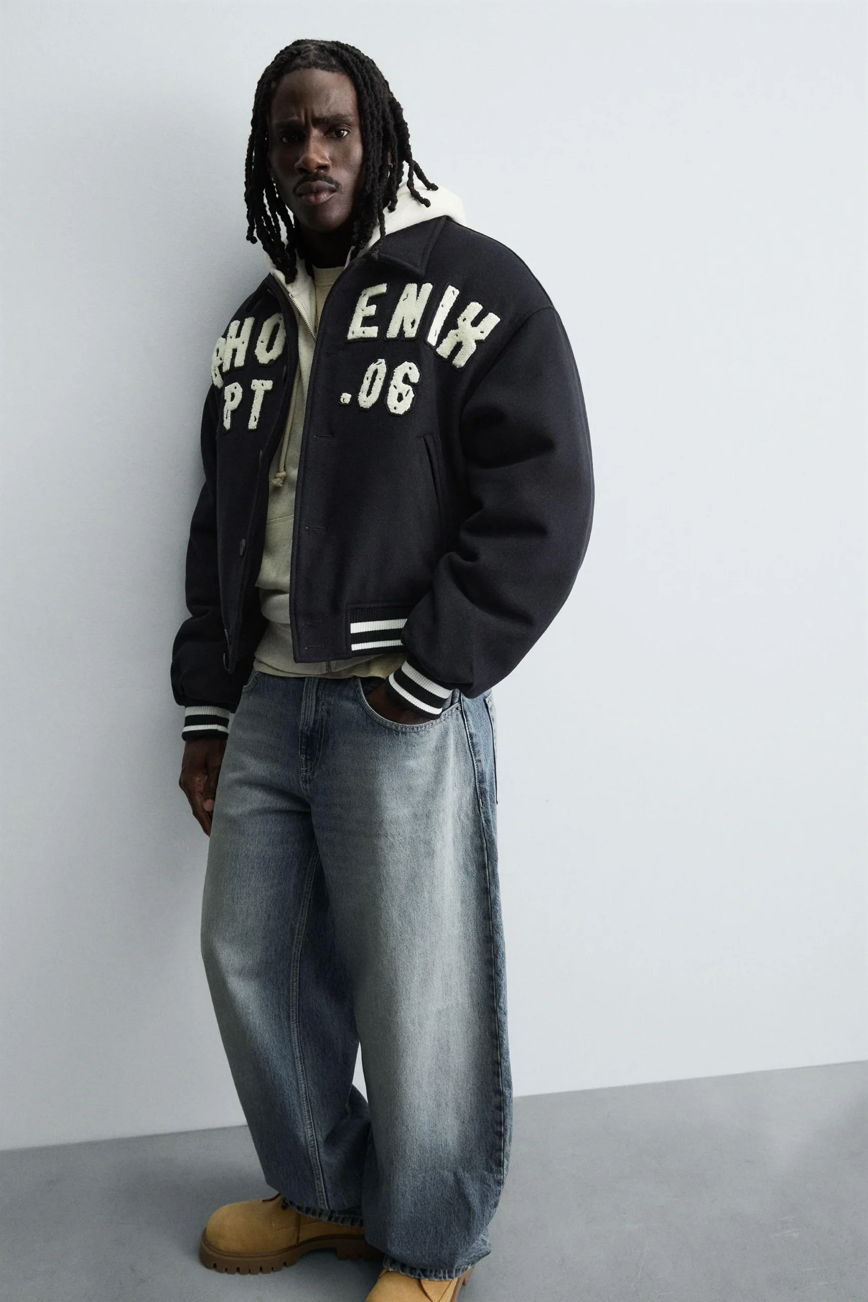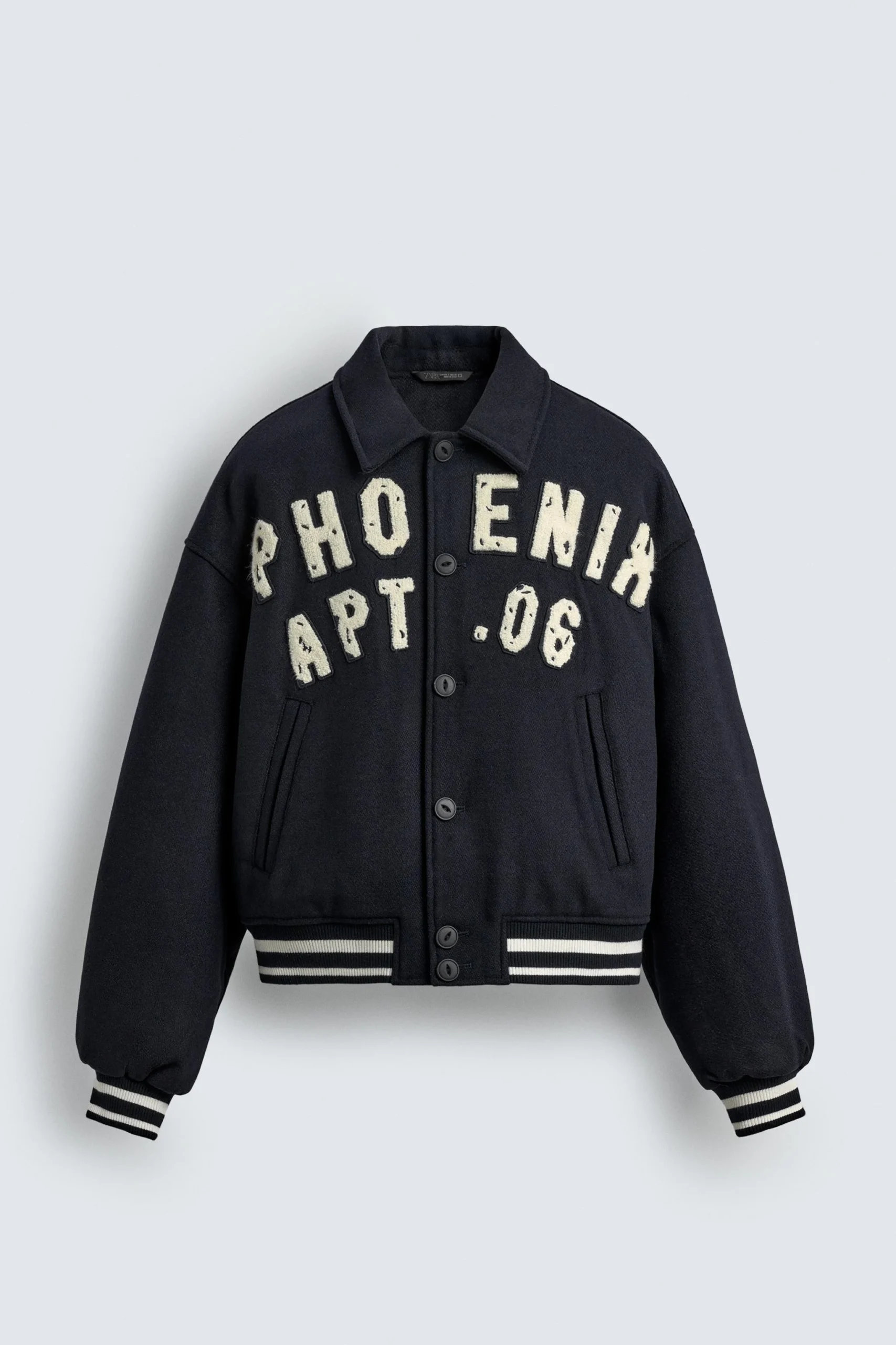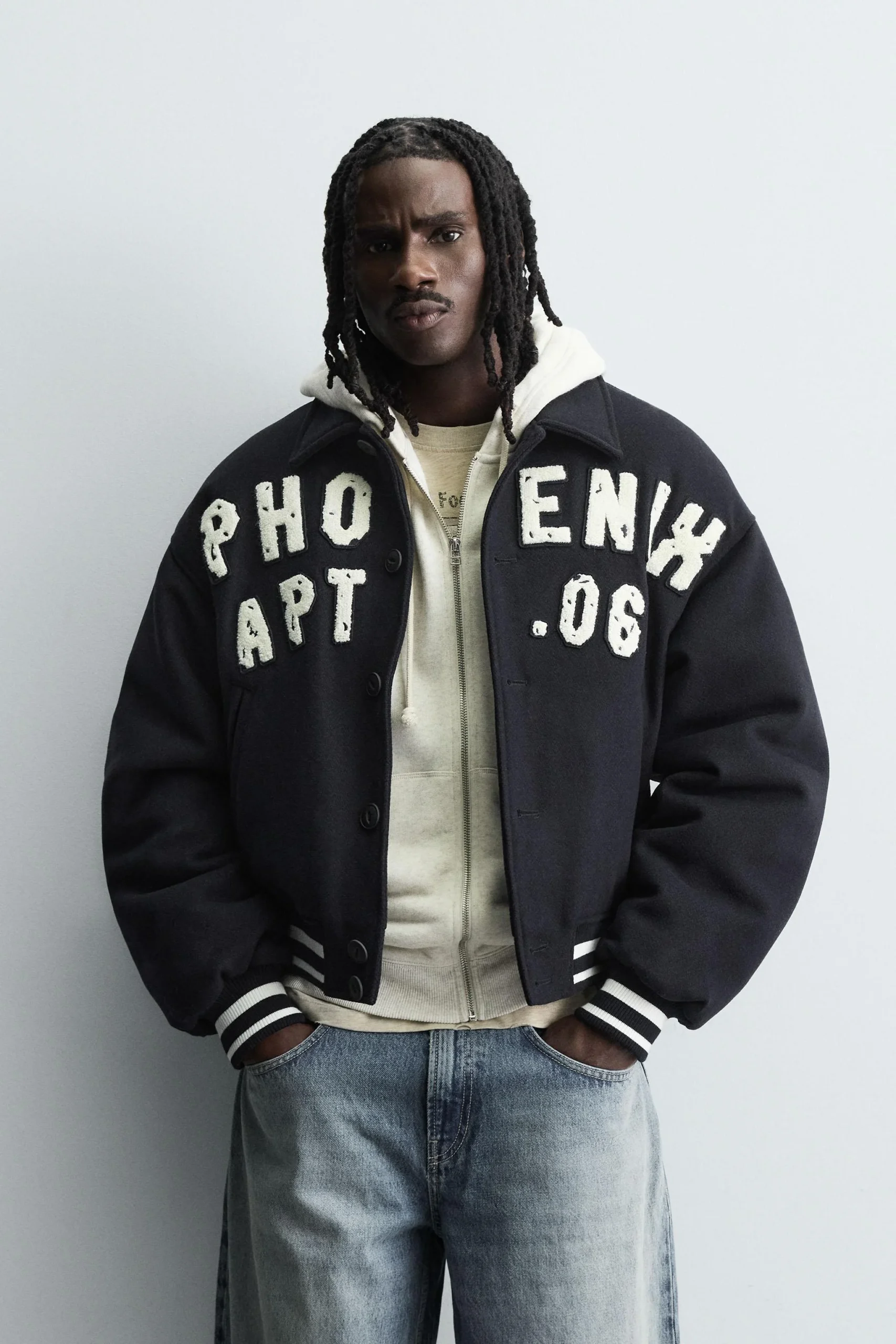 - طرح یا عنوان: کاپشن بمبر لحاف دوزی شده با وصله های تزئینی طرح کالج از برند زارا، با طراحی مدرن و اسپرت.