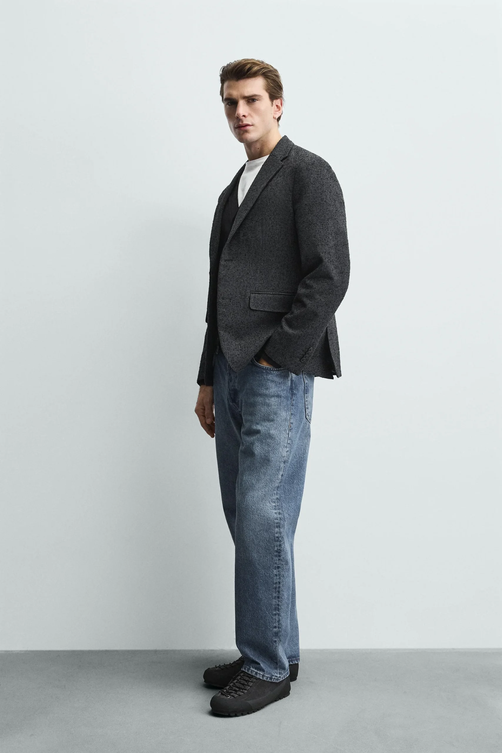 - طراحی: این کت با برش استاندارد (Regular fit) و طرح کلاسیک پیچازی (Houndstooth) طراحی شده است که با بافت خاص بوکله، ظاهری بسیار شیک، مدرن و متمایز به استایل شما می بخشد.
