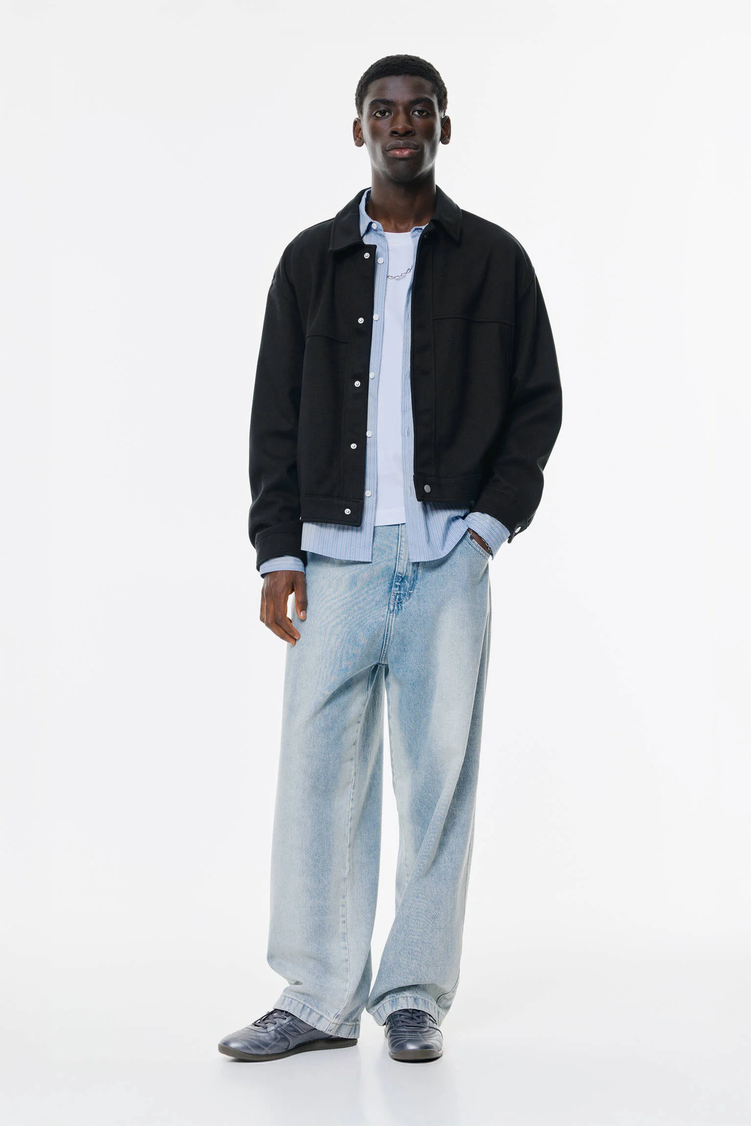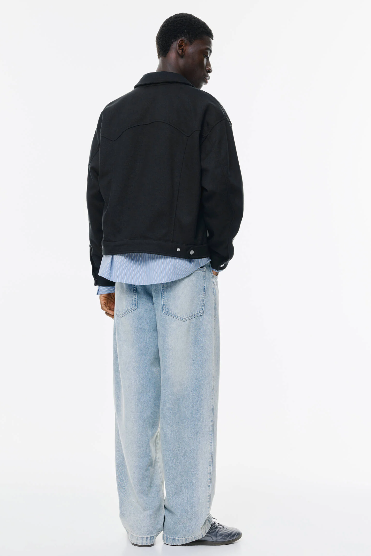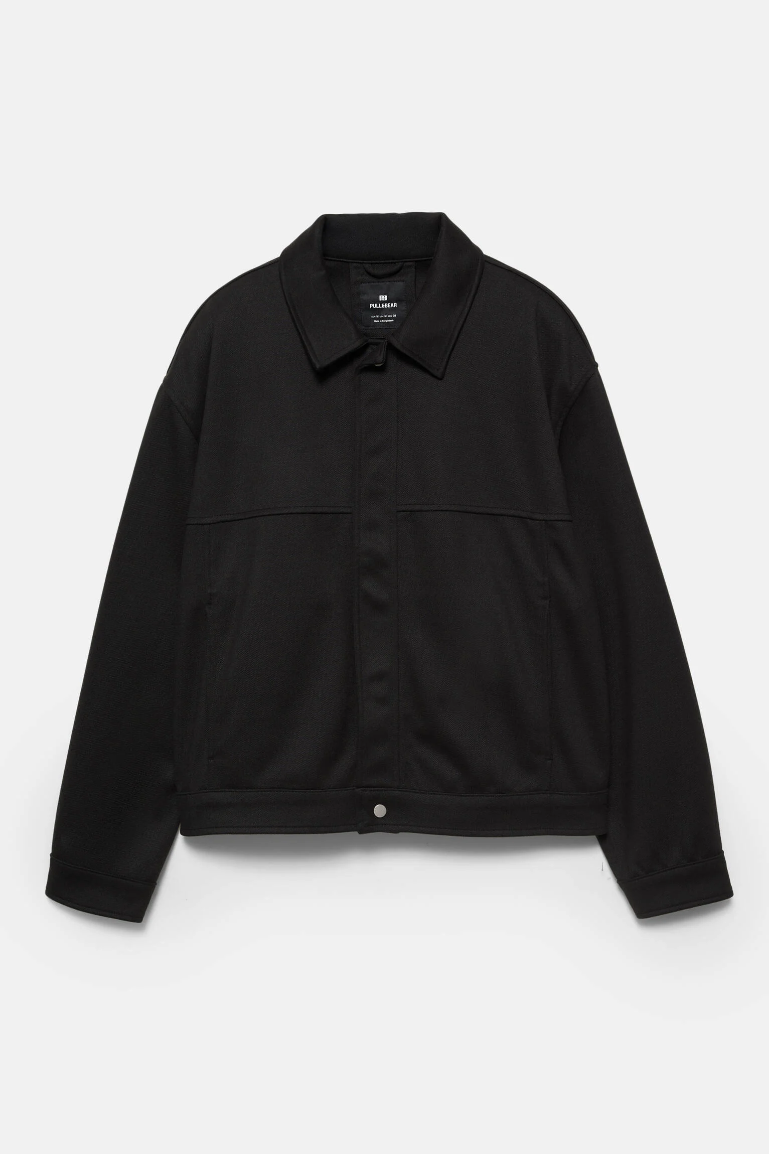 - طراحی و عنوان: کت بافت دار مشکی پول اند بیر با آستین بلند، یقه پیراهنی و دکمه های فشاری.