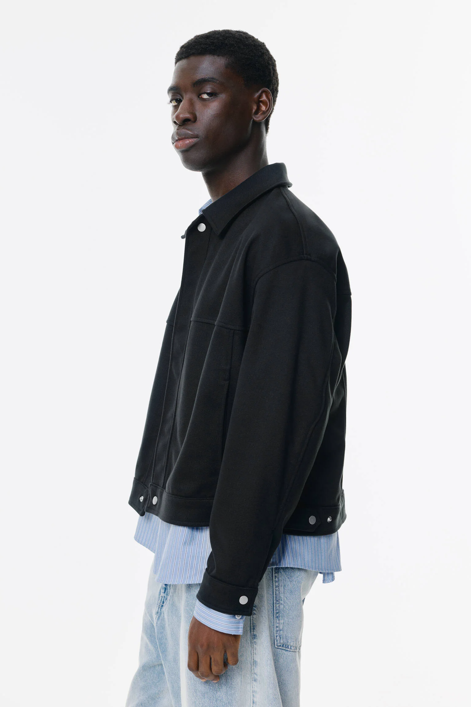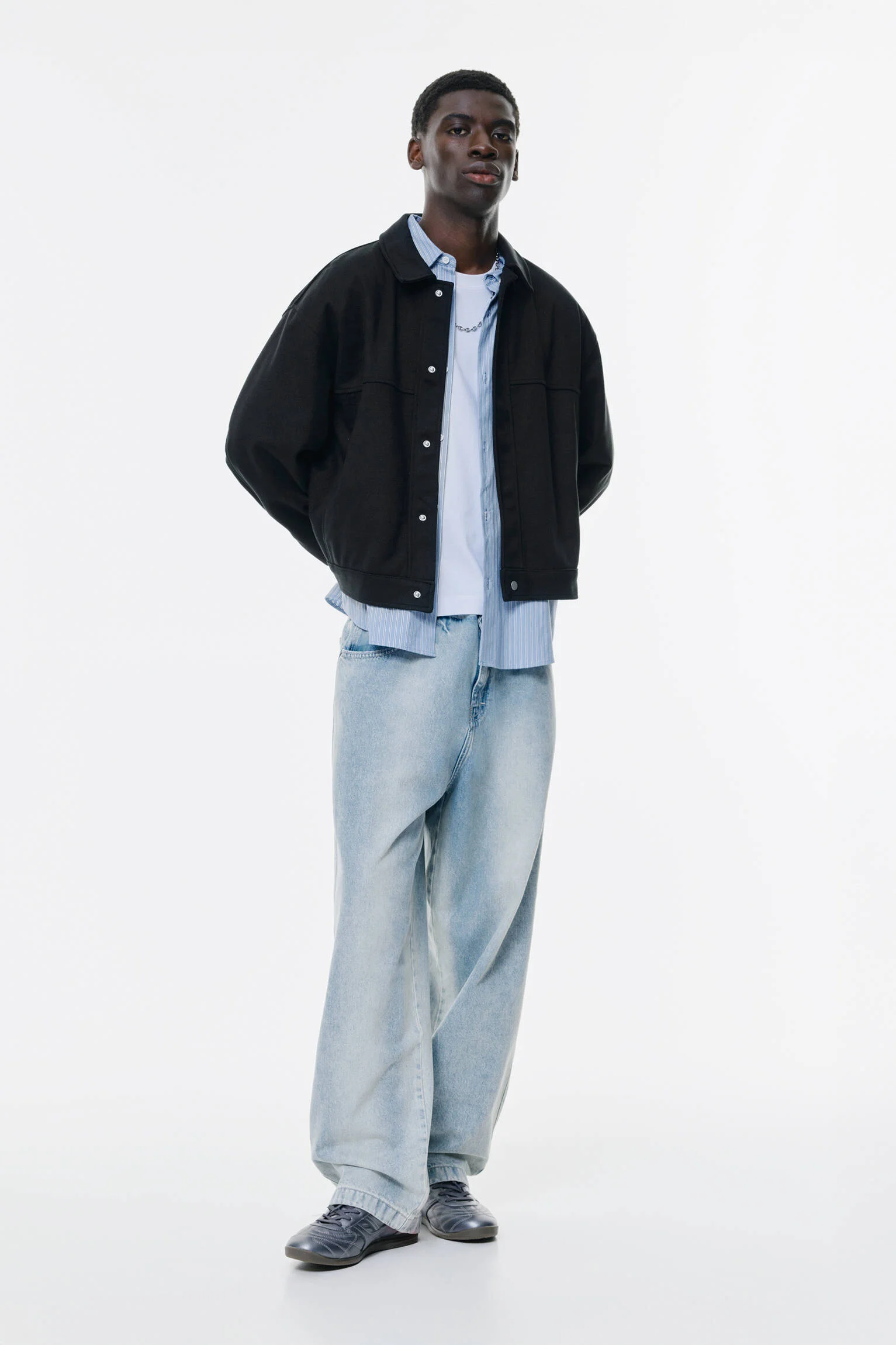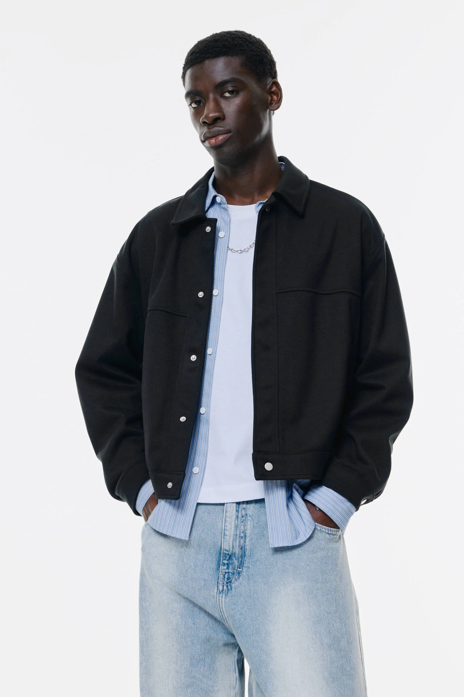 - طراحی و عنوان: کت بافت دار مشکی پول اند بیر با آستین بلند، یقه پیراهنی و دکمه های فشاری.