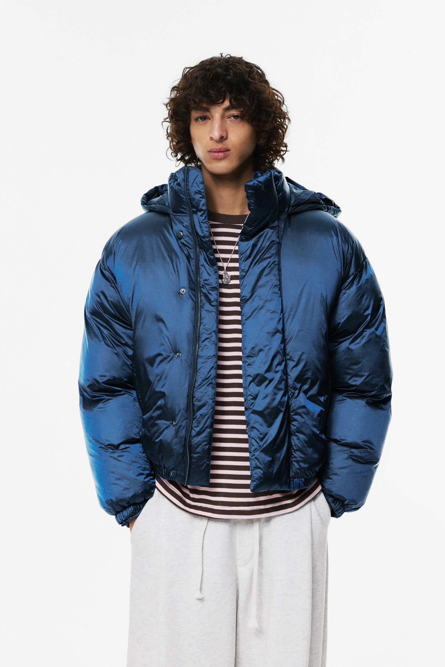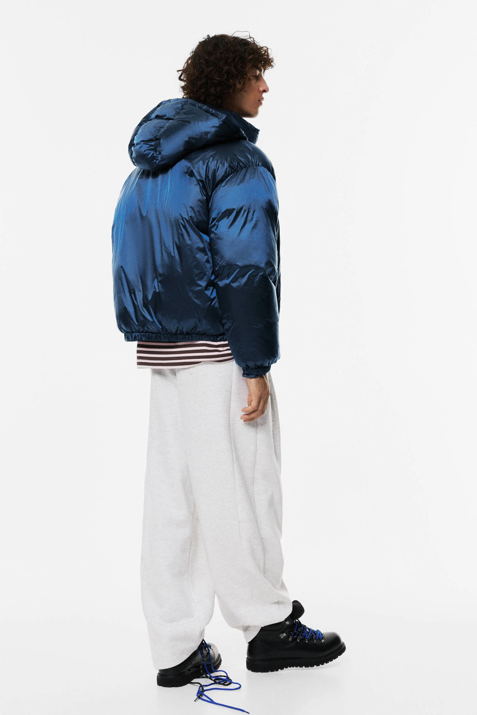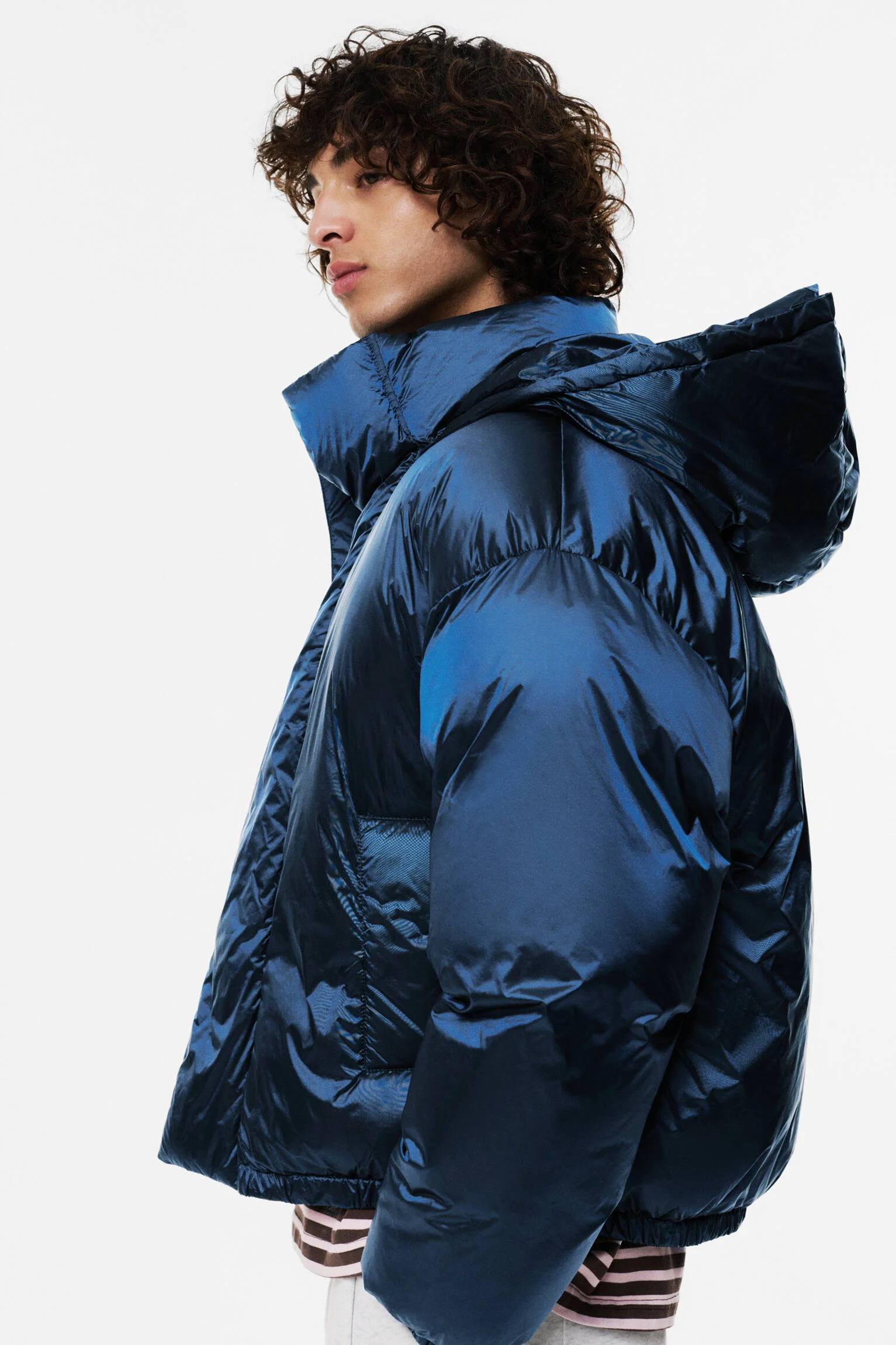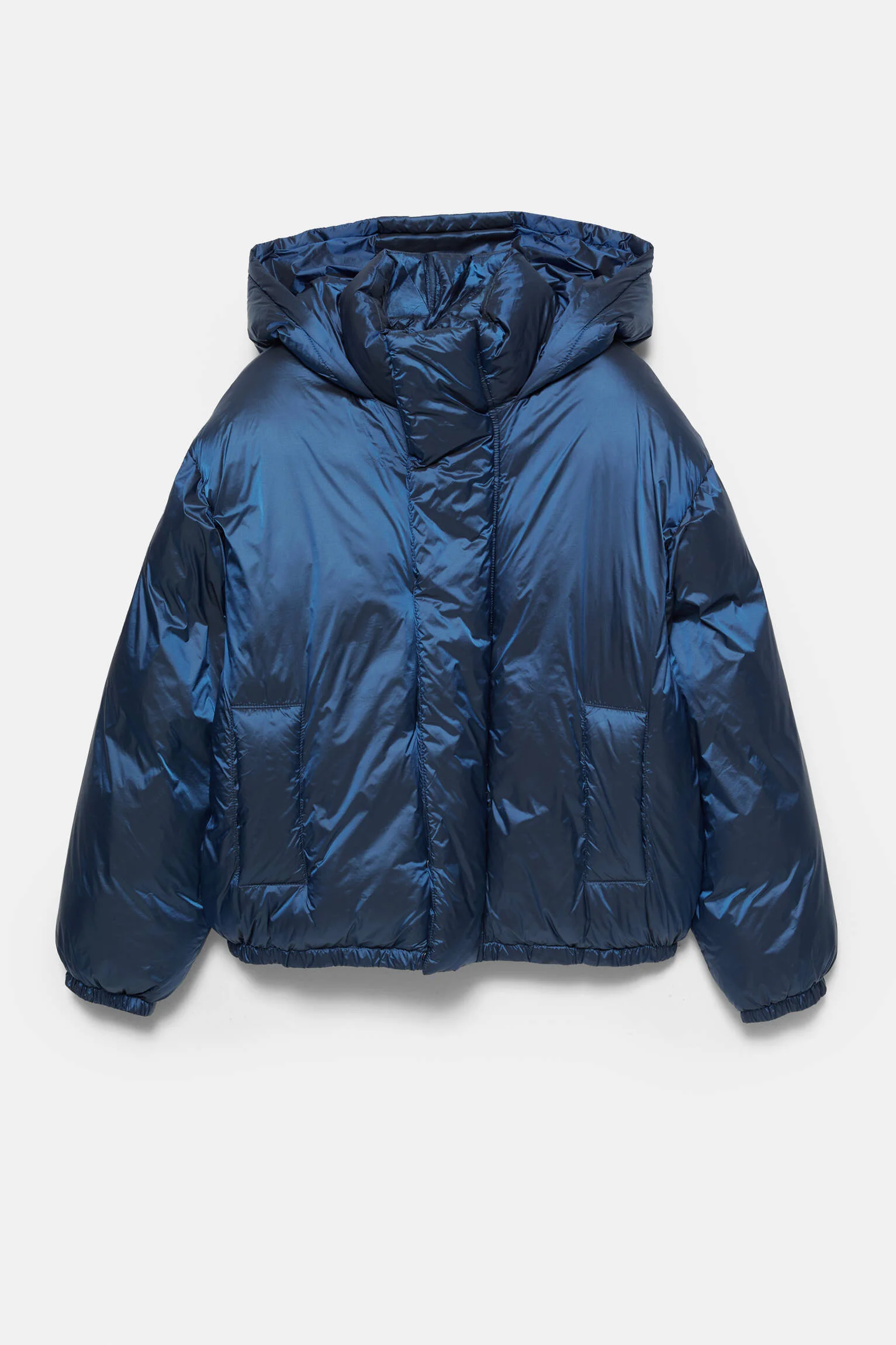 - طراحی یا عنوان: ژاکت پافر شیمری با طراحی کلاهدار، آستین بلند و ظاهری براق و جذاب.