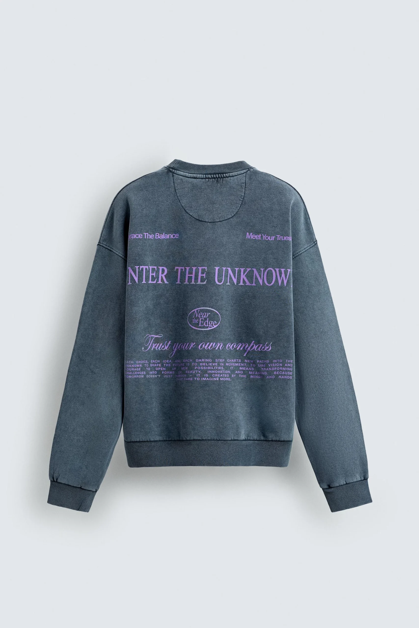- ویژگی های سوئیشرت: دارای چاپ های متنی متضاد در قسمت جلو و پشت لباس، تن خور آزاد برای راحتی بیشتر، رنگ خاص آبی محو (Faded blue) و ظاهری متمایز که به دلیل نوع شستشو، هر قطعه را از دیگری متفاوت می کند.