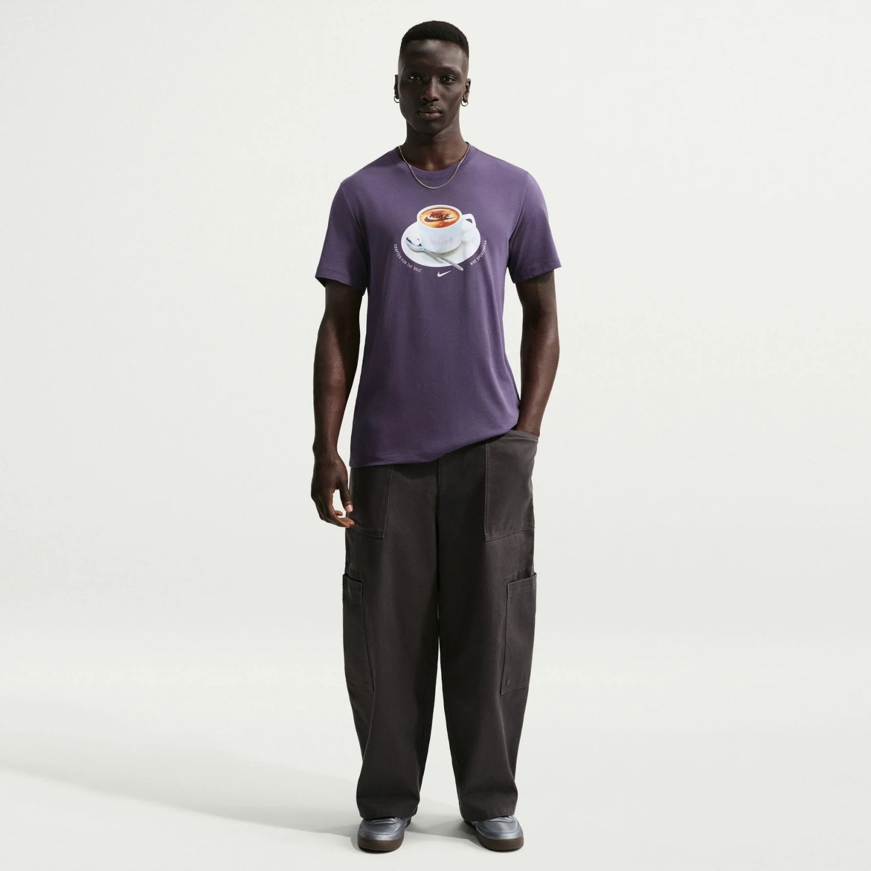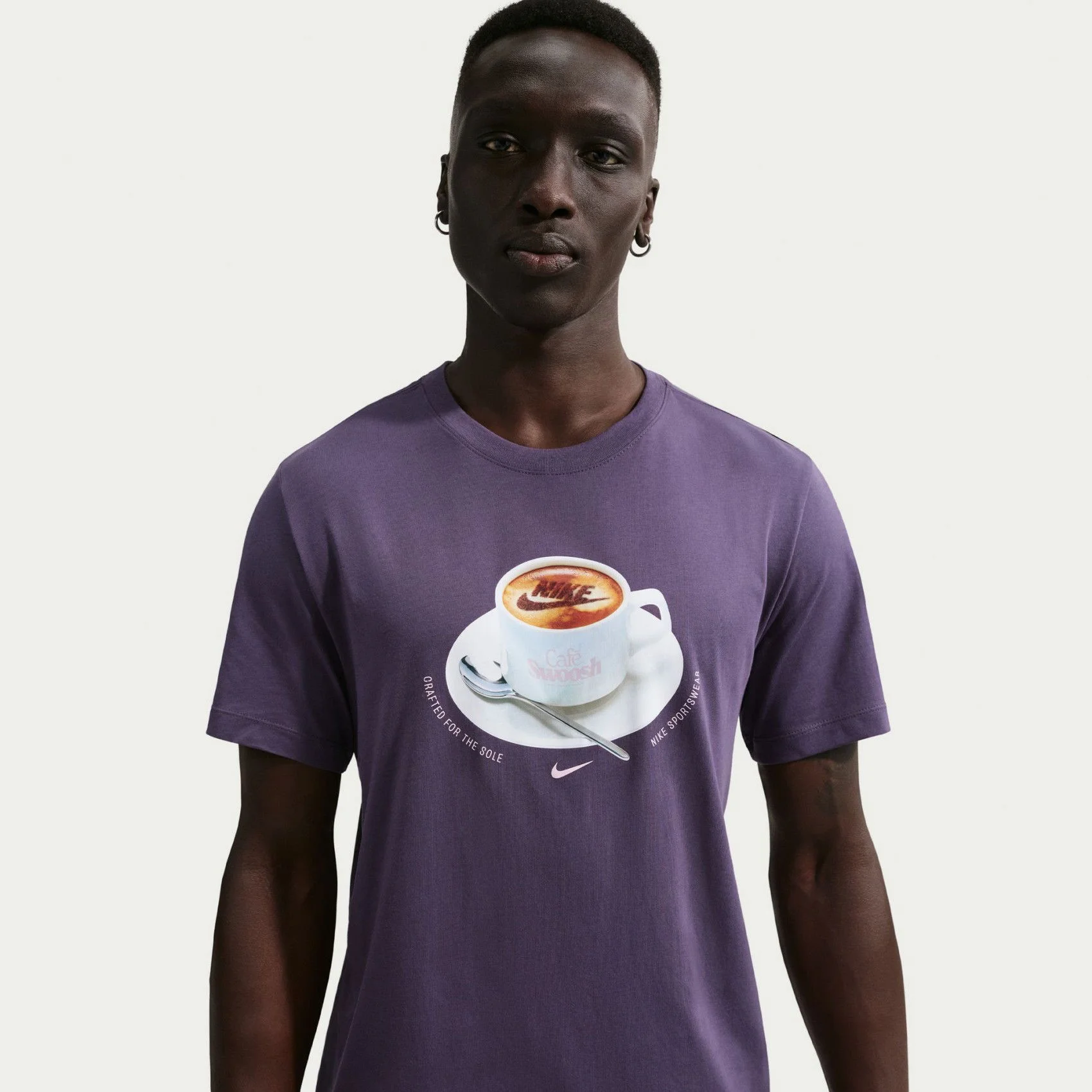 - طراحی: این تیشرت با رنگ بنفش جذاب و خیره کننده، دارای یک طرح گرافیکی خلاقانه به شکل ماگ قهوه با لوگوی نایک (Swoosh) روی سینه است که ظاهری مدرن و متمایز به استایل شما می بخشد.